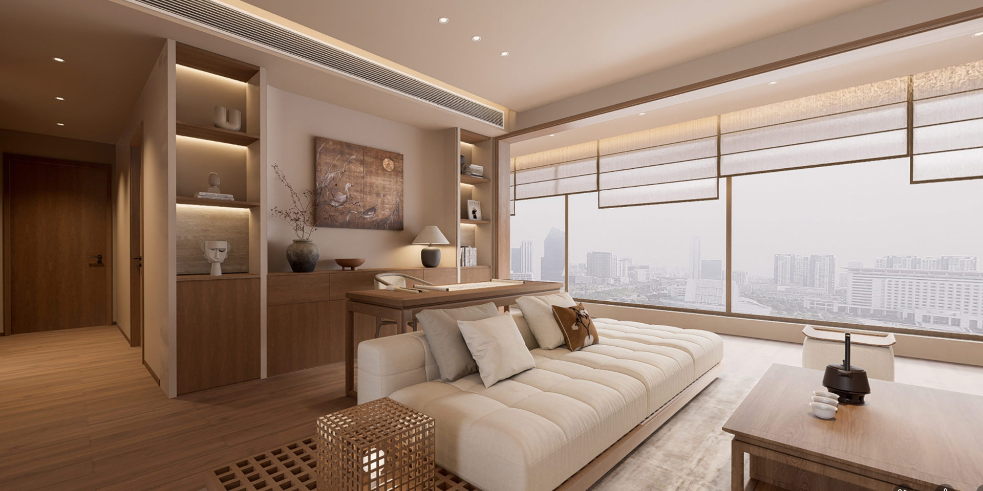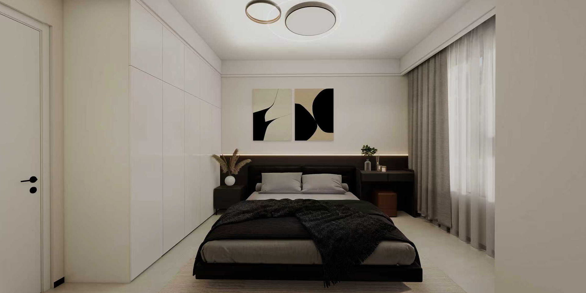 在簡(jiǎn)約的空間里通過(guò)材質(zhì)、色彩的運(yùn)用和軟裝的搭配呈現(xiàn)出現(xiàn)代輕奢的味道!石材與護(hù)墻板的混合使用,再加上金屬線(xiàn)條的點(diǎn)綴使電視背景墻成為整個(gè)空間的一大亮點(diǎn)!